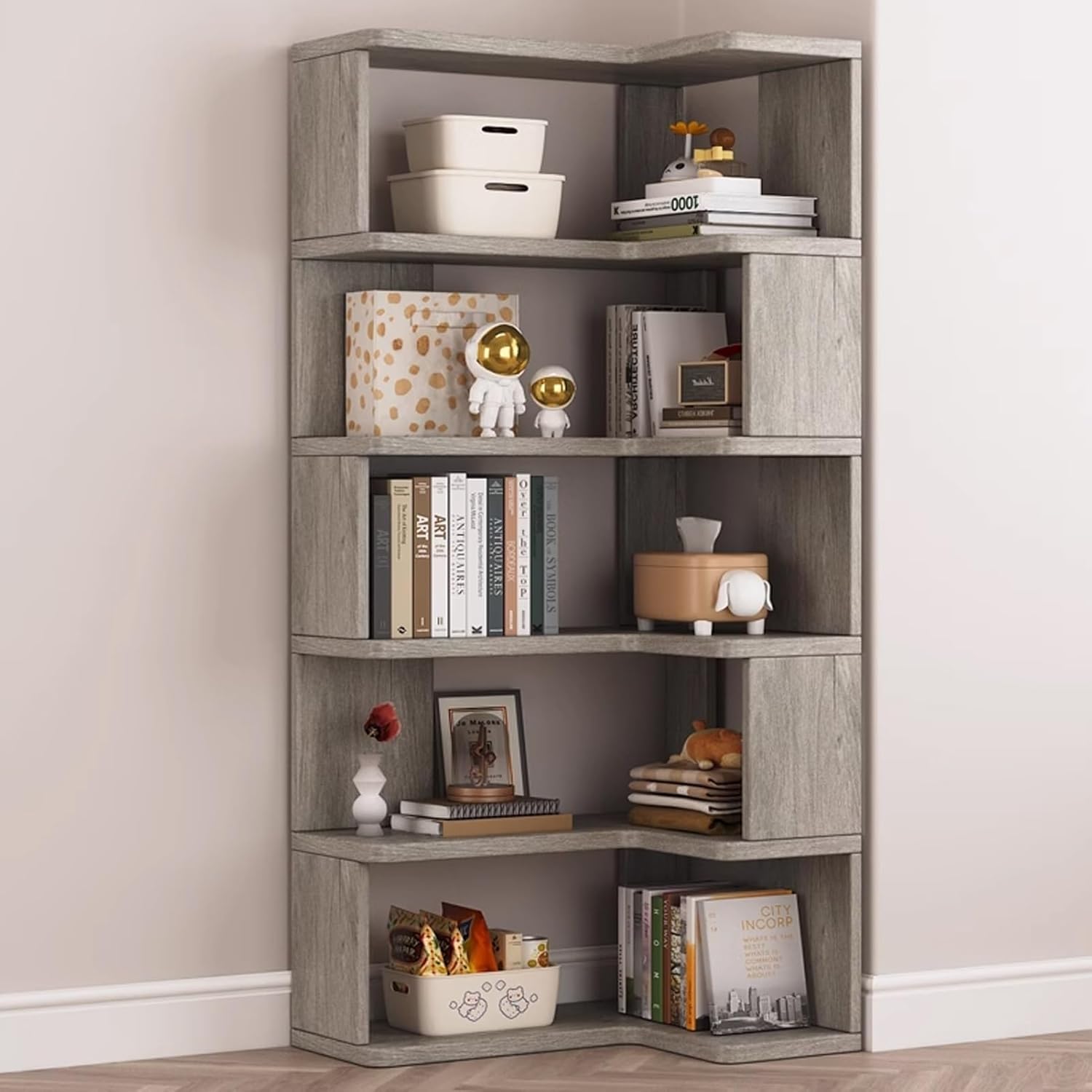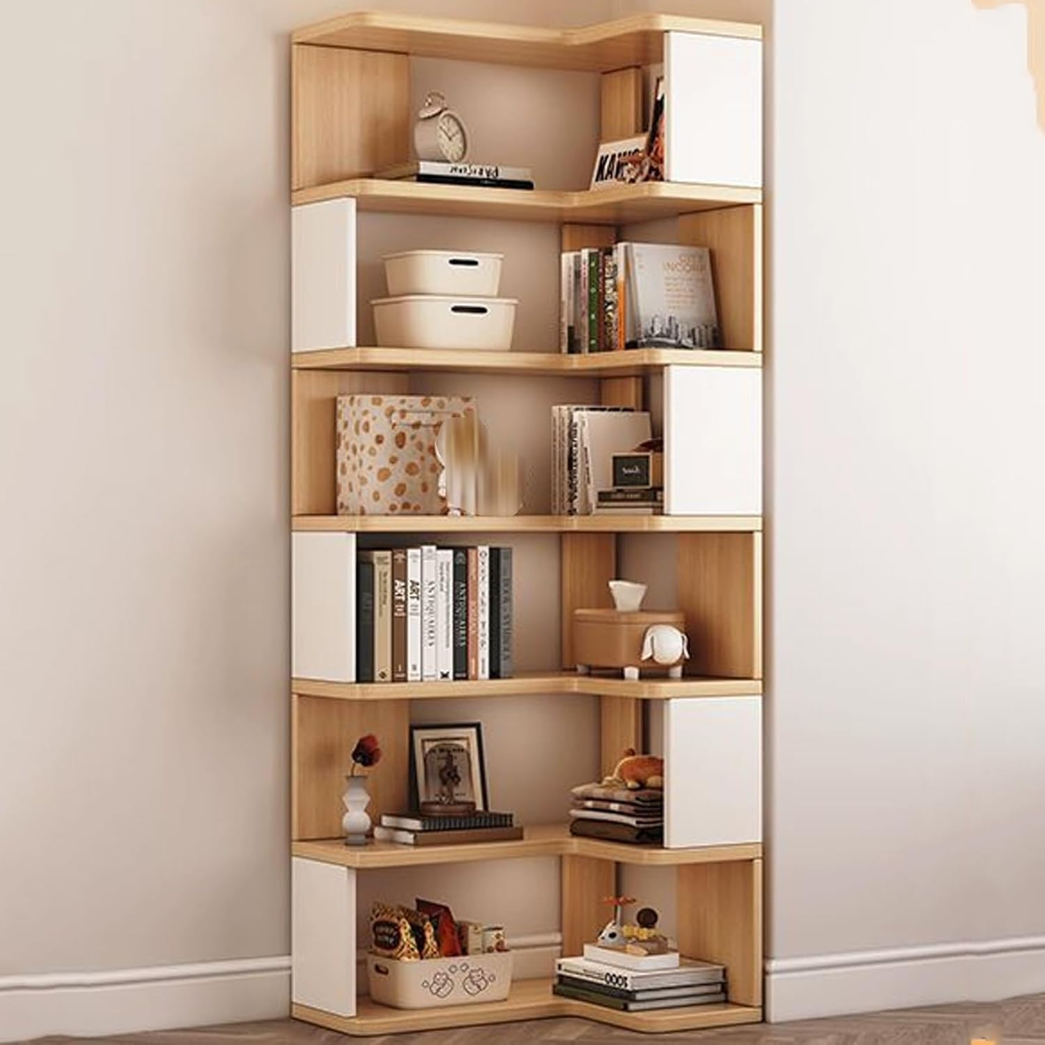 The corner design cleverly utilizes space, turning idle corners into practical and eye-catching display areas, adding a touch of fashion to your homeOur corner shelf provides ample storage space while taking up little floor spaceThe corner shelf is designed for simple assembly, you only need 30 minutes to assemble it.➤ Product parameters:Name: Corner bookshelf, L-shaped storage shelves, kids bookshelf, corner shelf,Material: Solid WoodSize: 60x40x159.7cm/23.6×15.7×62.8in , 60x40x191.3cm/23.6×15.7×75.3in,60x40x222.9cm/23.6×15.7×87.7in, 65x45x159.7cm/25.5×17.7×62.8in , 65x45x191.3cm/25.5×17.7×75.3in,65x45x222.9cm/25.5×17.7×87.7in, 80x60x159.7cm/31.4×23.6×62.8in , 80x60x191.3cm/31.4×23.6×75.3in,80x60x222.9cm/31.4×23.6×87.7in, 90x50x159.7cm/35.4×19.6×62.8in , 90x50x191.3cm/35.4×19.6×75.3in,90x50x222.9cm/35.4×19.6×87.7in, 90x55x159.7/35.4×21.6×62.8in , 90x55x191.3cm/35.4×21.6×75.3in,90x55x222.9cm/35.4×21.6×87.7in Packing list: 1 x corner bookshelf.➤ Note:1. The above size parameters are measured manually, there will be an error of about 1-3 cm, thank you for your understanding.2. Due to monitors, shooting light and other factors, the product color may be slightly different from the picture, thank you for your understanding.