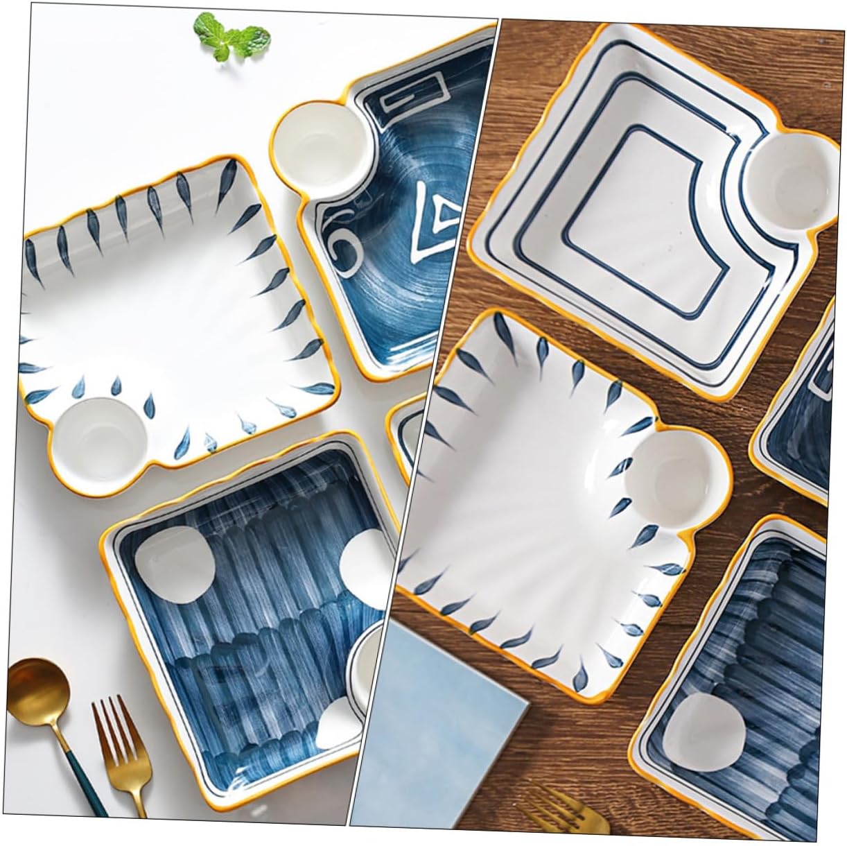 Package List 4 x Plates Characteristics - Color: Assorted Color. - Material: Ceramics. - Size: 18.50X17.50X3.50cm/7.27X6.88X1.38in. -Product Info:Sushi dessert plate - The bottom of the plate adopts a unique design, placed on the table is not easy to slid, very safe sushi serving plate. - It can be used as a Western food plate wonderfully, which can increase your appetite well appetizer platter. - This creative multi-grid plate is very suitable to be used for three meals or snacks snack serving tray. - Made of great quality material, it's and safe for use. - This dish is not only suitable for hotel use, but also suitable for home use, compact appearance, is a beautiful home furnishings japanese style sushi plate.Goods Informationmini sushi dishes This food plate is made of safe and ceramics, and beautiful, practical and .sushi serving plate strong and sturdy.olive oil dipping bowls The unique design and craftsmanship its popularity and practicality.chip dip serving platter The design is simple, and the surface is smooth without burrs.sushi dipping bowls It is very convenient to use, and the two-zone design is very practical.fish plate for sushi The ceramic material has a texture