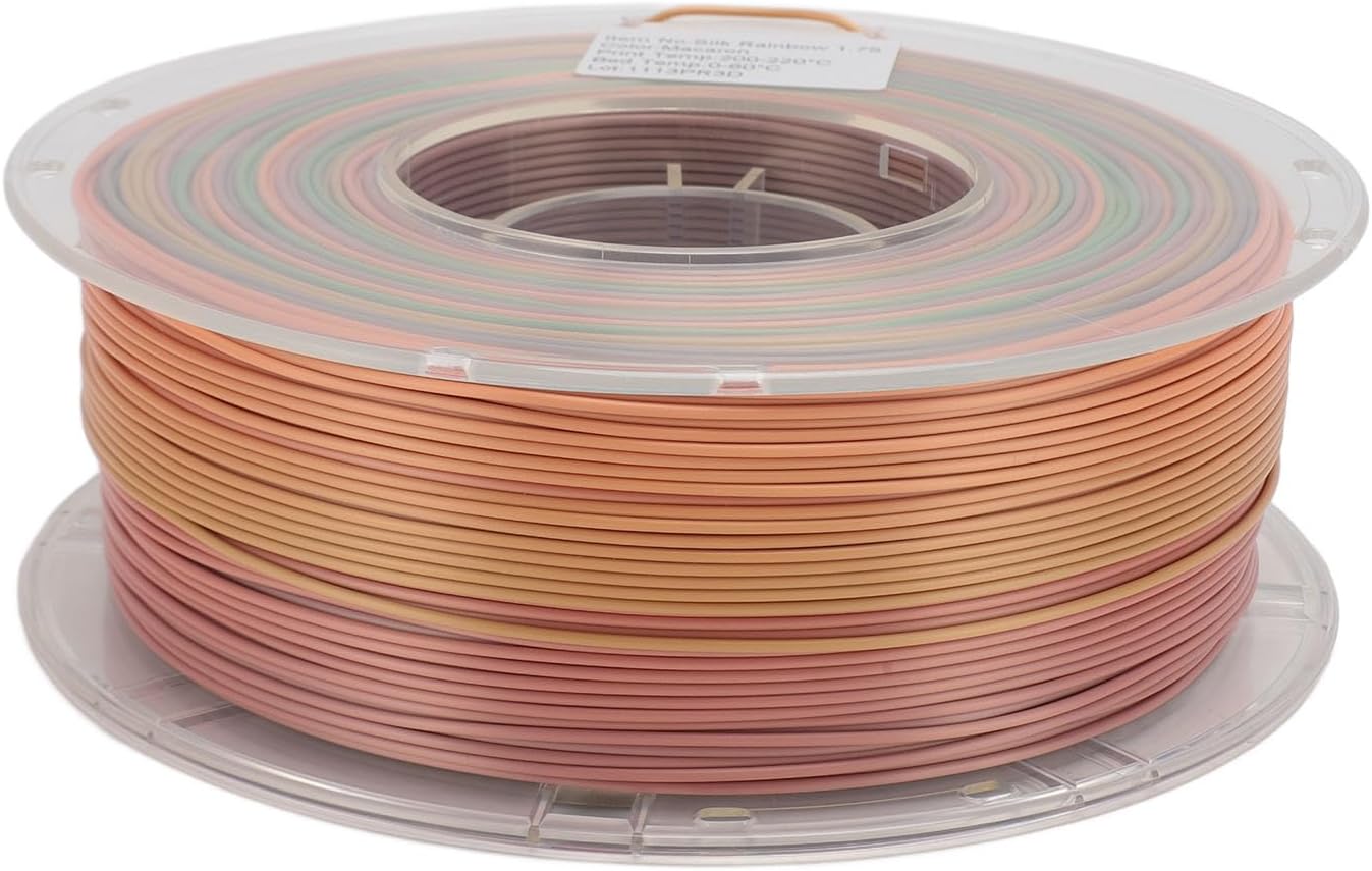 1. GRADIENT COLOR: 3D printer filament consists of a variety of gradient colors, adding a silky metallic feel and gorgeous appearance, with a satin sheen, more eye catching and unique. 2. MELTING EVENLY: Gradient 3D printing filament provides smoother printing results, no bubbles, melting evenly and won't clog nozzles or extruders. 3. 1.75MM: High toughness PLA filament is 1.75mm with +/‑ 0.02mm diameter tolerance, more stable and smoother 3D printing, recommended printing temperature 200 to 220°C. 4. : 3D printer filament PLA 1.75mm is made of degradable material, no pollution, you can use it with peace of mind. 5. WIDELY COMPATIBLE: Multicolor PLA filament 1.75mm is compatible with for 3D printers, suitable for printing arts and crafts. Spec: Item Type: 3D Silk PLA Filament Material: PLA Color: Colorful Item Diameter: 1.75 mm +/- 0.02 mm Recommended Print Temperature: 200°C to 220°C Recommended Bed Temperature: 0°C to 60°C Length: 1KG/2.2lbs = 340meter / 371yd PLA filament features: 1. Bright Color 2. Low Shrinkage/Good Toughness 3. Easy to Print, No Odor 4. No Air Bubbles. Mechanical Winding Components, No Knots 5. Compatible with for 3D Printers, Suitable for Printing Arts and Crafts How to Use: Remove the product and use it packing list: 1 Roll x 3D Silk PLA Filament